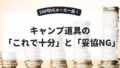 着替え、傘、キャンプギアを置くラック、カイロ、耳栓、濡れたものを掛けるハンガー・紐、サンダル(テント内で履く脱ぎ履きが楽なもの)など。